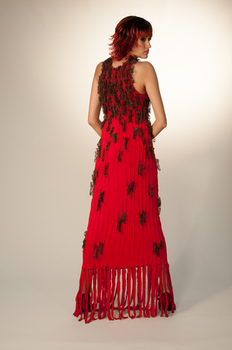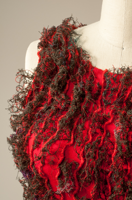 Free motion stitched netting, pre-consumer textile waste pieced with Merrow stitching