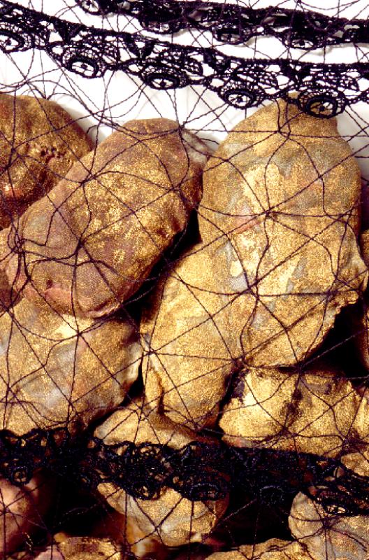 Thread, silk chiffon, fabric remnants, gold leaf, machine stitched