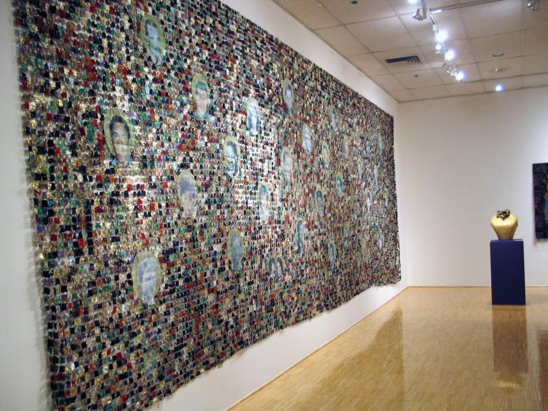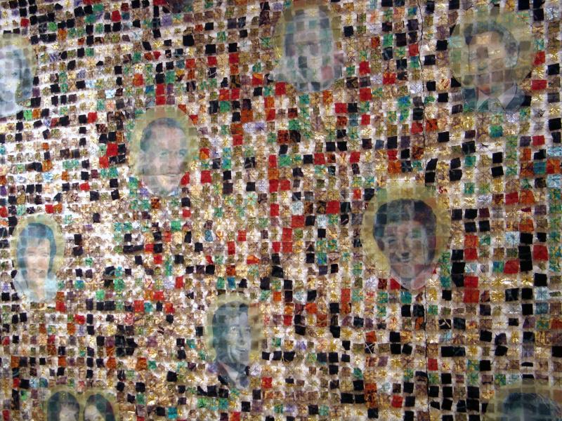 Thread, fabric remnants (hand dyed and printed silk, gold lamé, polyester), metallic pigment, stitching, digital printing on silk organza