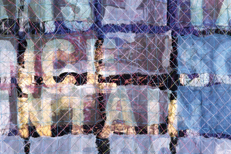 Fabric remnants, digital printing on silk gauze, discharge printing, thread, stitching