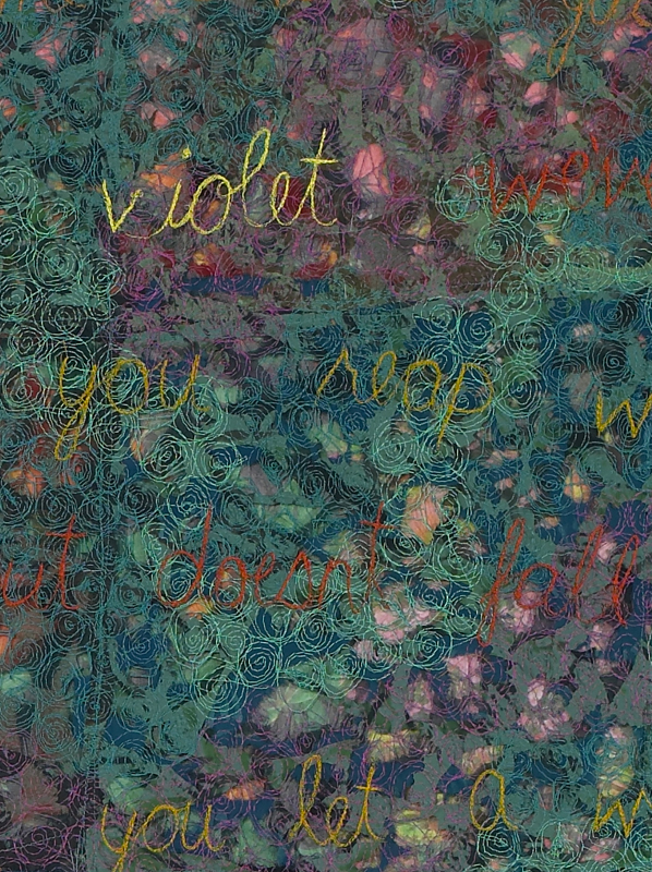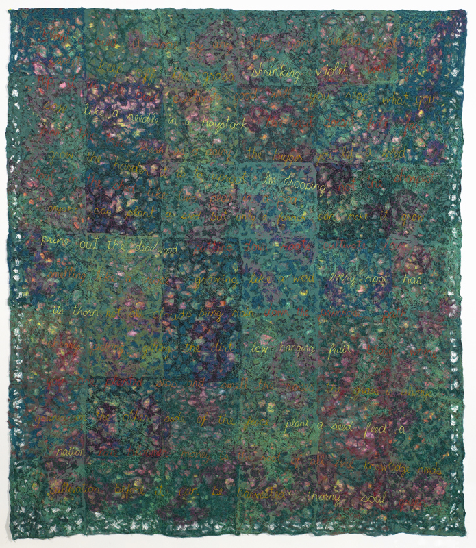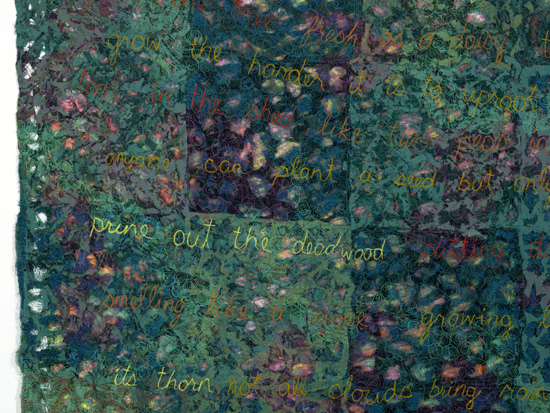 Thread, hand dyed, printed, and laser cut fabric remnants, machine stitching