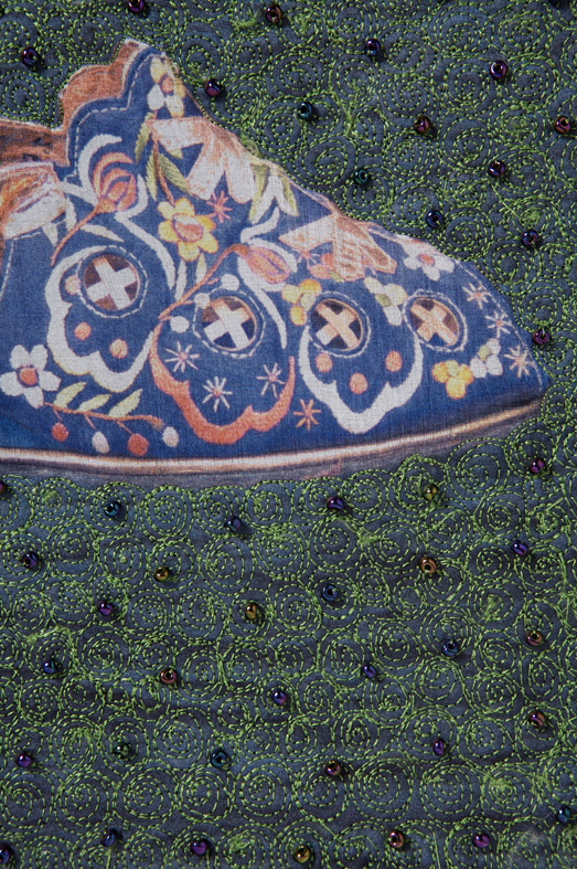 Gaza’s Shoes is a tribute to the late Gaza Bowen. Gaza was a brilliant artist famous for her handmade shoes, shoe sculptures with feminist overtones, and sculptures/installations from reclaimed materials. This piece is created from digitally printed photographs of shoes from Gaza’s own closet which were generously donated to the UC Davis Design Collection.